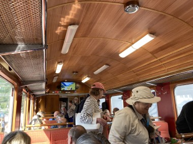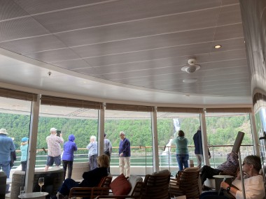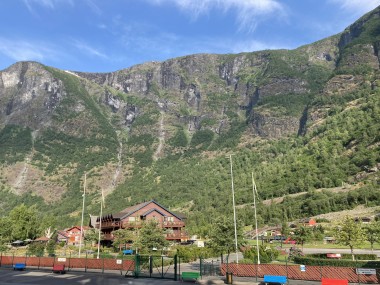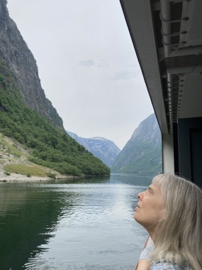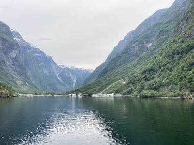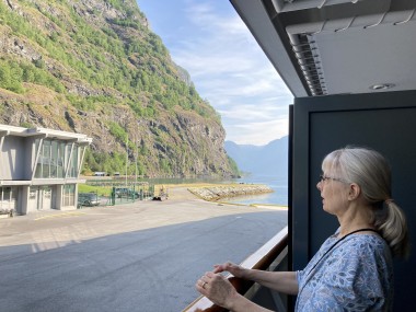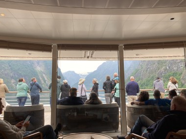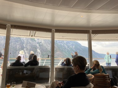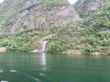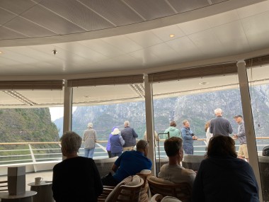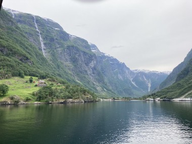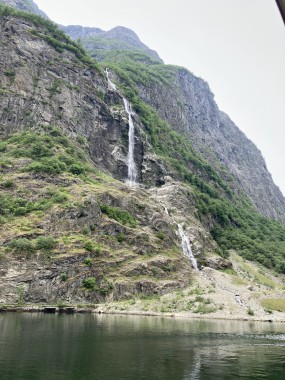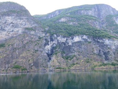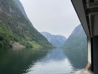 Once we got back to the ship and set sail, the captain decided we had time to sail down a side fjord that is supposed to be one of the most beautiful. Martha and I watched from the observation lounge for a bit, but we were exhausted and went back to our cabin for a 1 hour nap. When we woke up, we were near the end of the fjord, so we still got to see it (and take pictures) on our way back out of it. If I understand the map correctly, this fjord is called the Nærøy Fjord and ends at a place called Gudvangen.