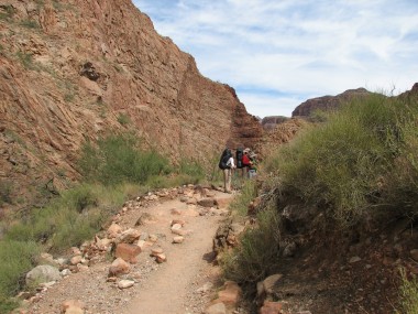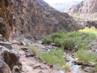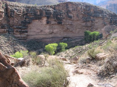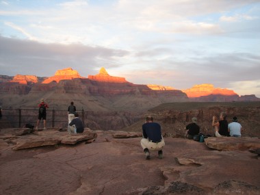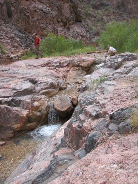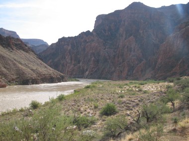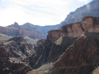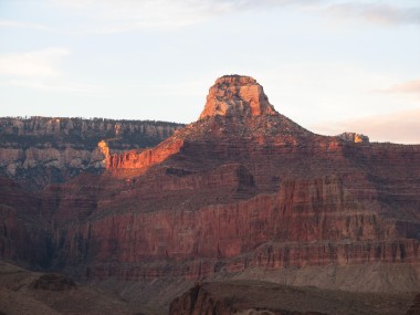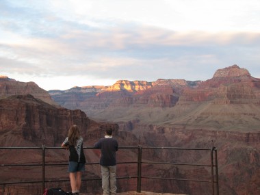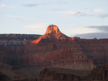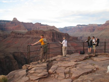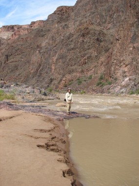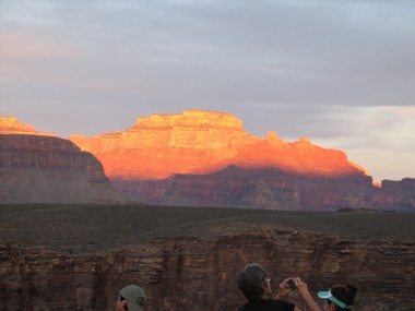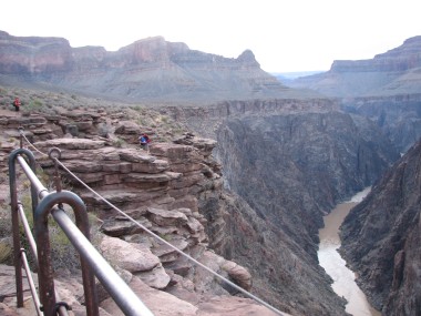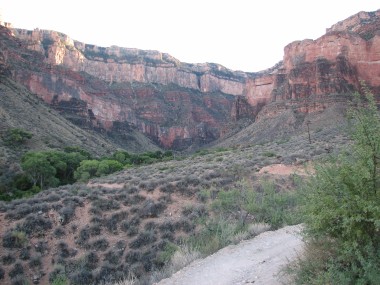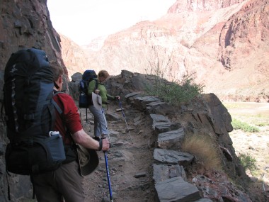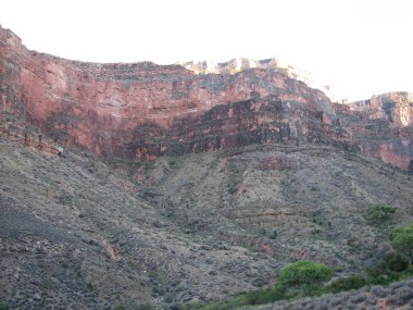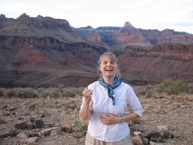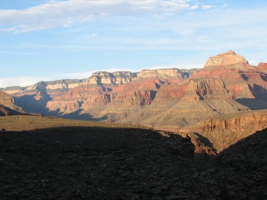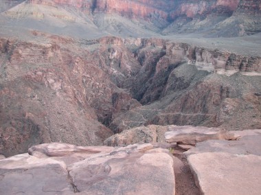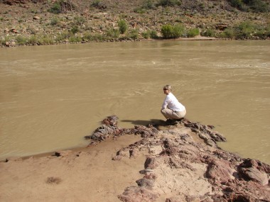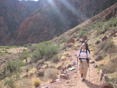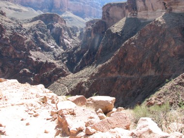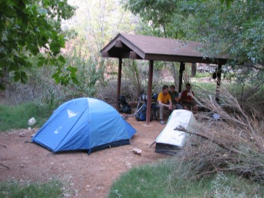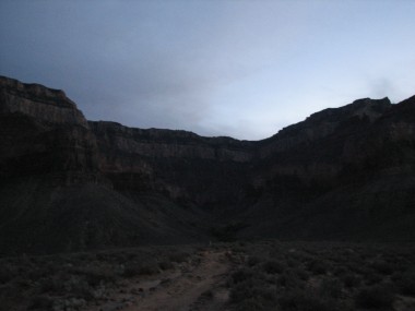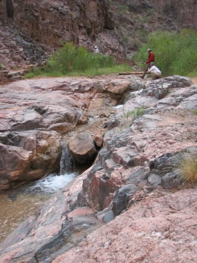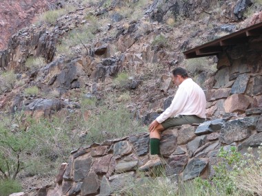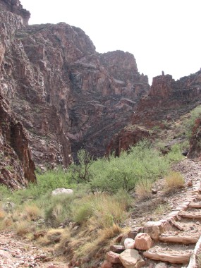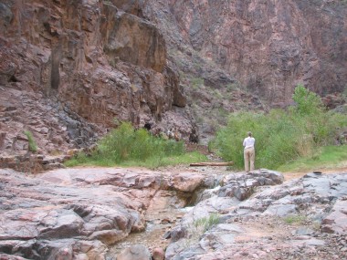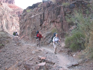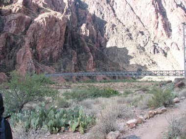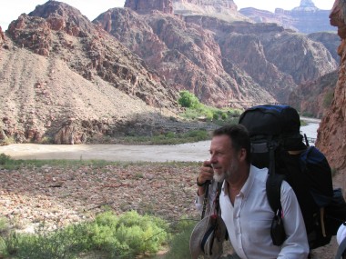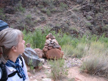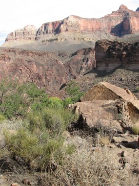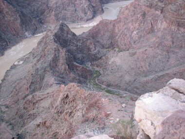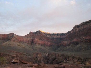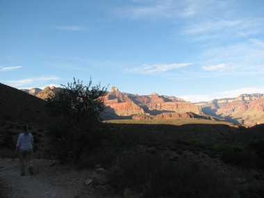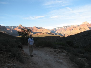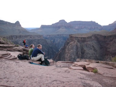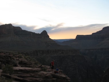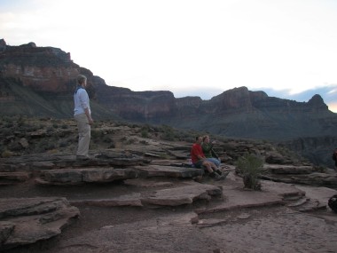 On our third day in Grand Canyon (Thursday, September 27) we hiked from Bright Angel Campground to Indian Garden. Along the way we reached the summit of our inverted mountain and touched the Colorado River. After making camp at Indian Garden, we hiked about a mile and a half out to plateau point to watch the sun set.