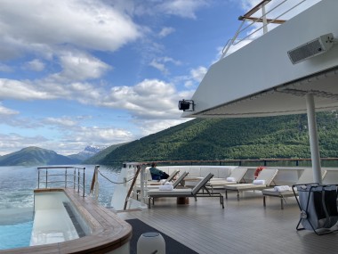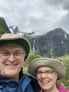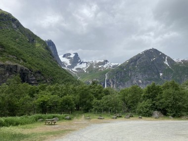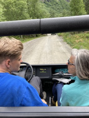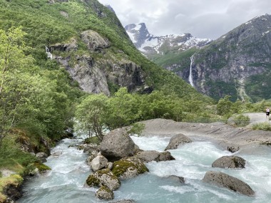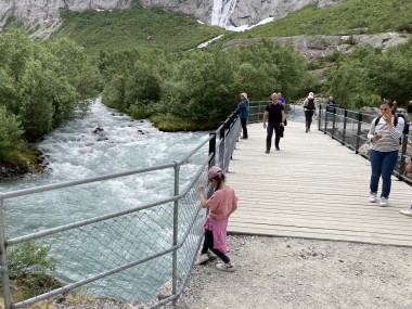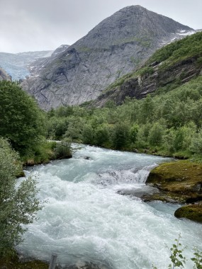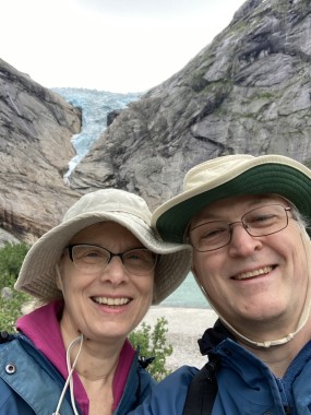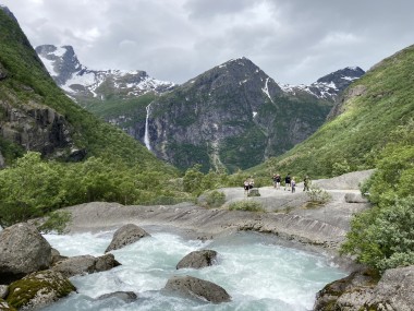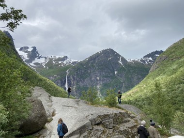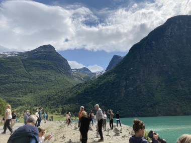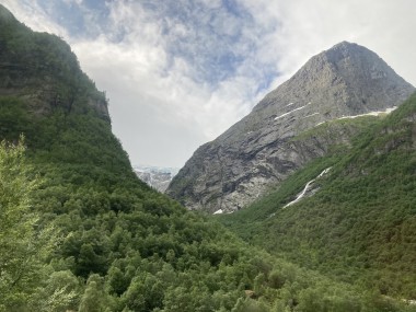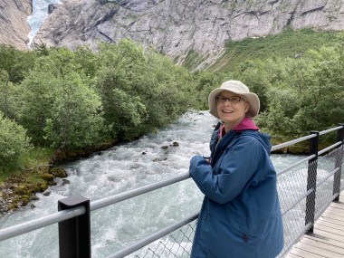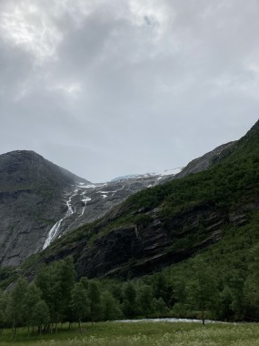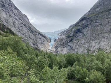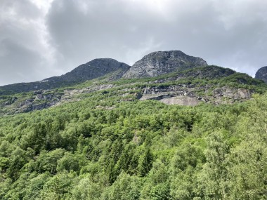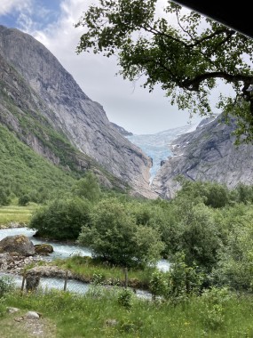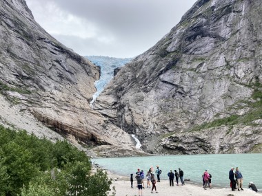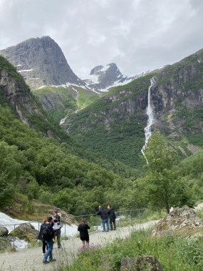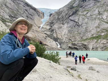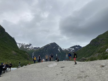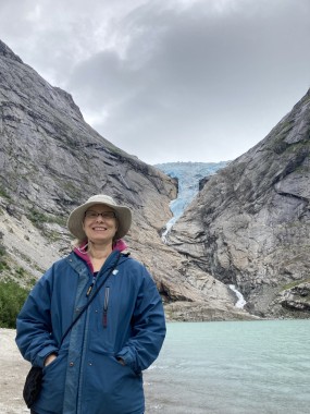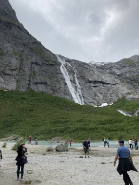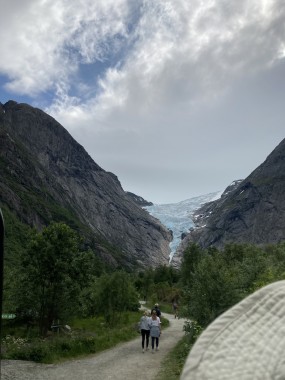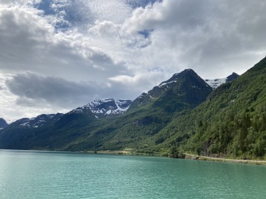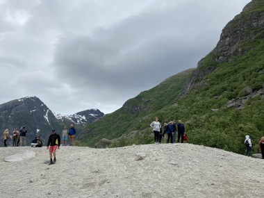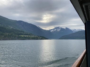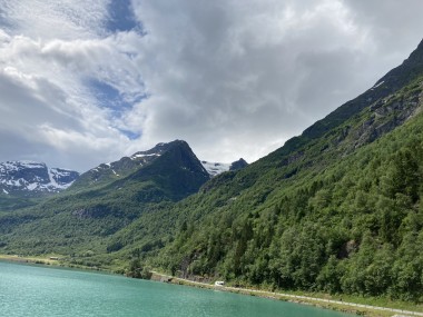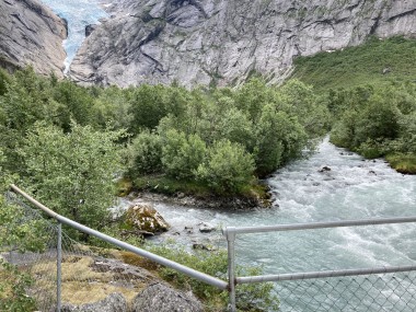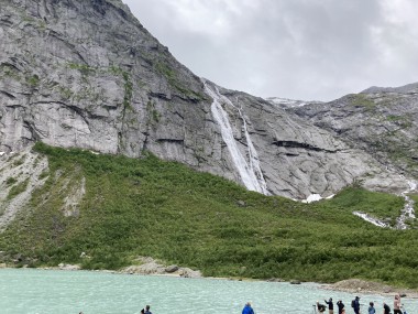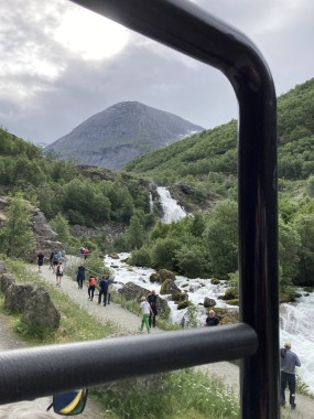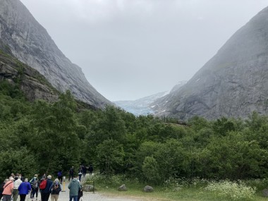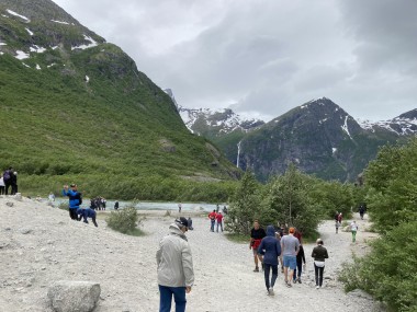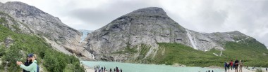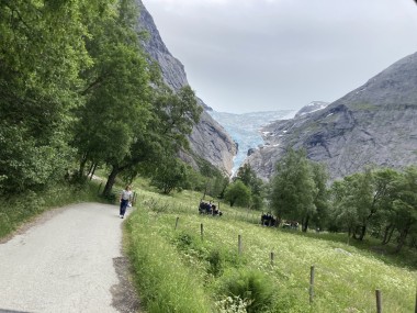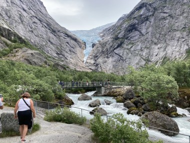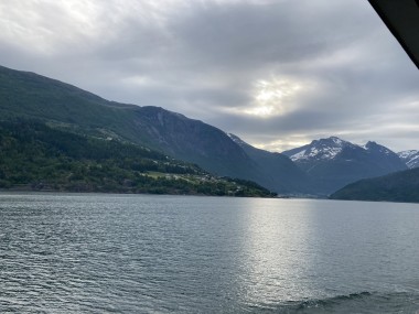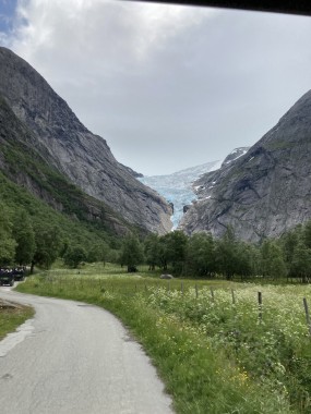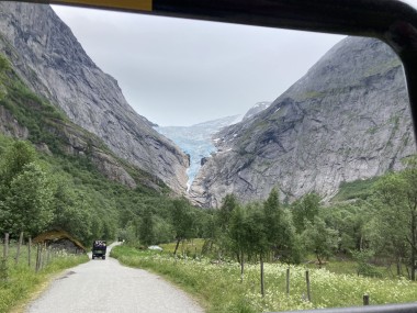 On Monday morning we found ourselves sailing into the port of Olden. The tender boats were used to bring us ashore for our excursions. The excursion Martha and I picked was Briksdal Glacier with Troll Cars. Our daily program says, “Briksdal Glacier lies at the end of the enchanting Oldedalen Valley and is part of the Jostedal glacier ice field, which is the largest glacier on the European mainland.” A bus took us inland to a lodge where we got into something they called a troll car; you can see them in some of the photos below. These let us out closer to the glacier, but it was still about a half mile hike to get up to where we got the best view of it. I’ve included a bunch of photos including a panorama shot.